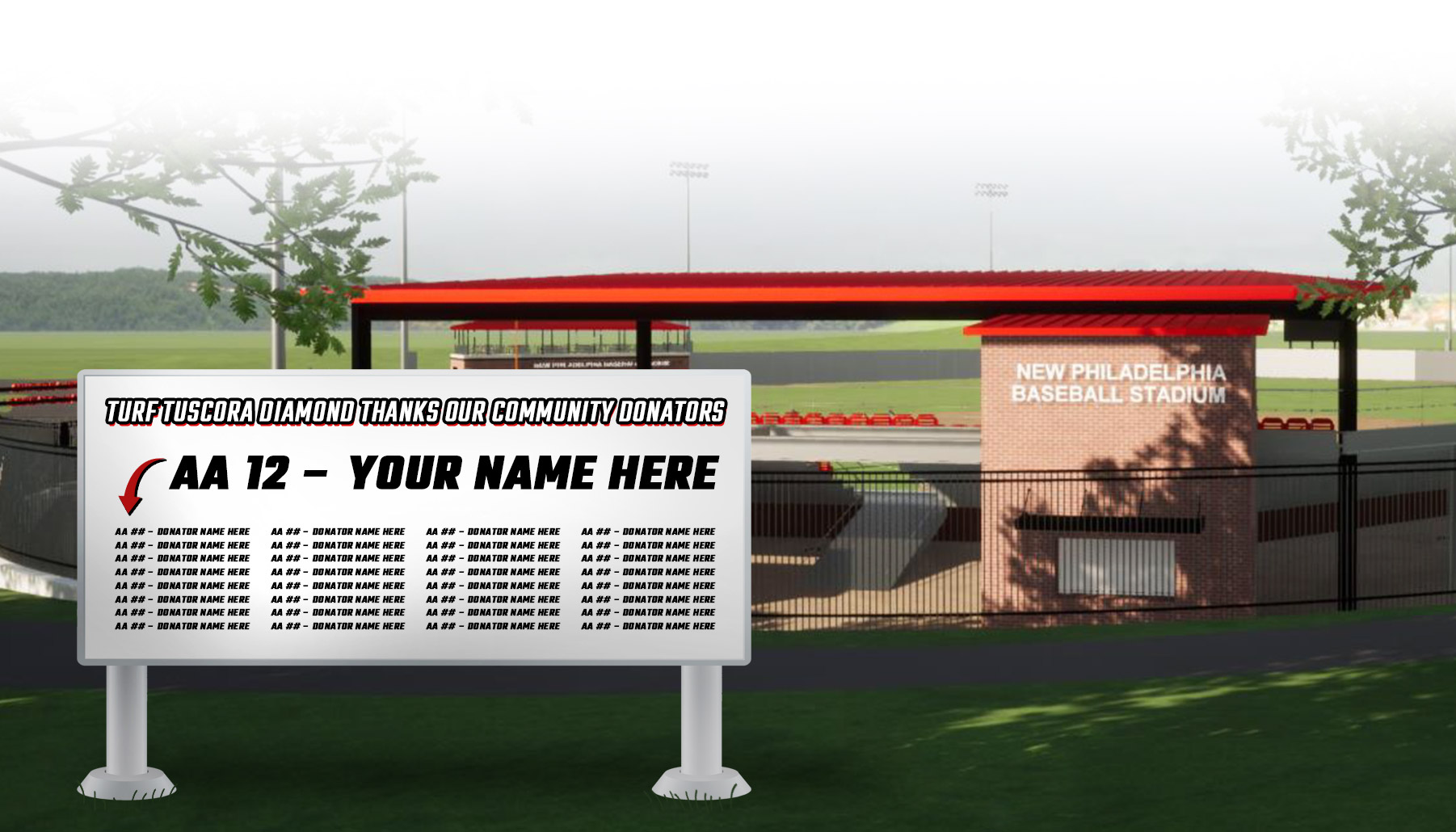 Your sponsorship to the Turf Tuscora Diamond campaign will secure your name on a dedicated sign, showcasing the list of all alphabetized donor names along with their respective turf tile coordinates. This is a unique opportunity to be permanently recognized for supporting the renovation of Tuscora Park's major league baseball diamond into a state-of-the-art complex for athletes of all ages.